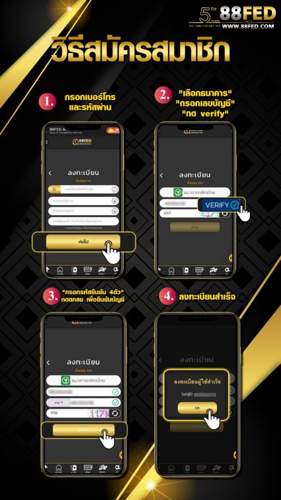 การสมัครสมาชิก กับ THUNDER 95 ทำได้ง่ายมาก เพียงกรอก เบอร์โทรศัพท์ ตั้งรหัสผ่าน และผูกบัญชี ธนาคาร หรือวอเลท เท่านี้คุณก็สามารถเริ่มต้น ใช้งานได้ทันที ไม่เกิน 1 นาที